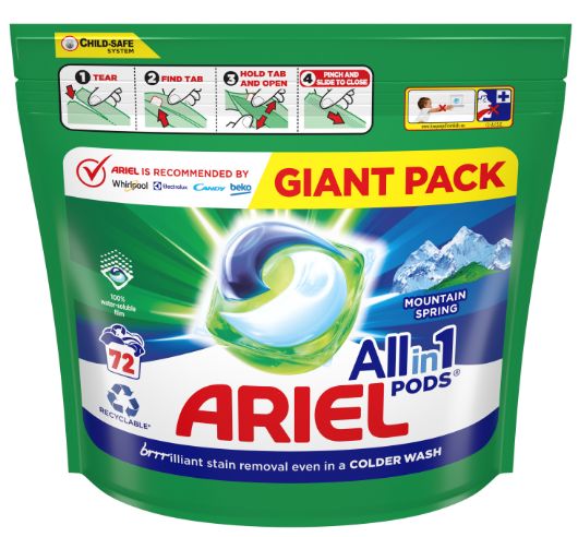 Ariel Mountain Spring gélové kapsule na pranie 72ks – dokonalá čistota a sviežosť