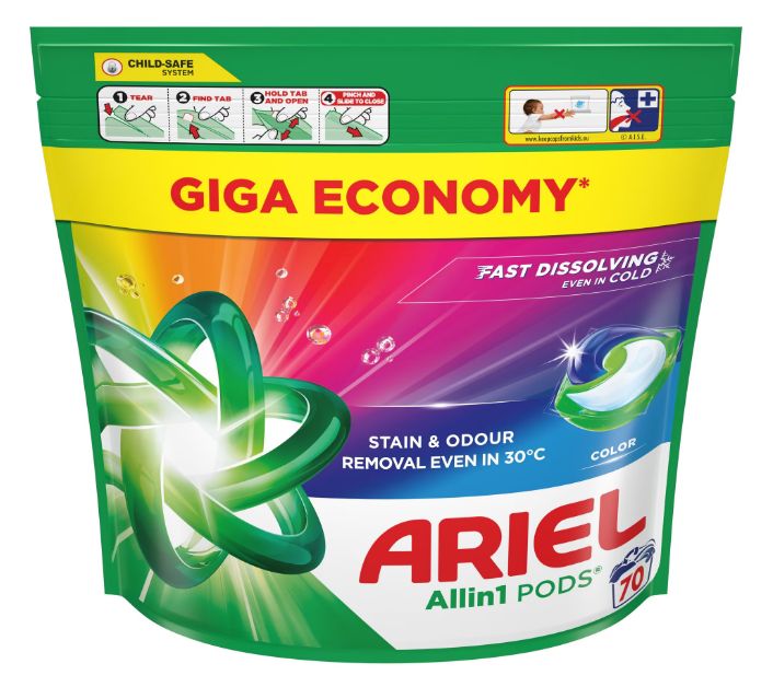 Ariel Color gélové tablety sú efektívny prací prostriedok pre farebné prádlo, ktorý zabezpečuje dôkladné odstránenie škvŕn a ochranu farieb už pri nízkych teplotách. Každá tableta je pred dávkovaná, čo uľahčuje použitie a eliminuje potrebu odmeriavania.