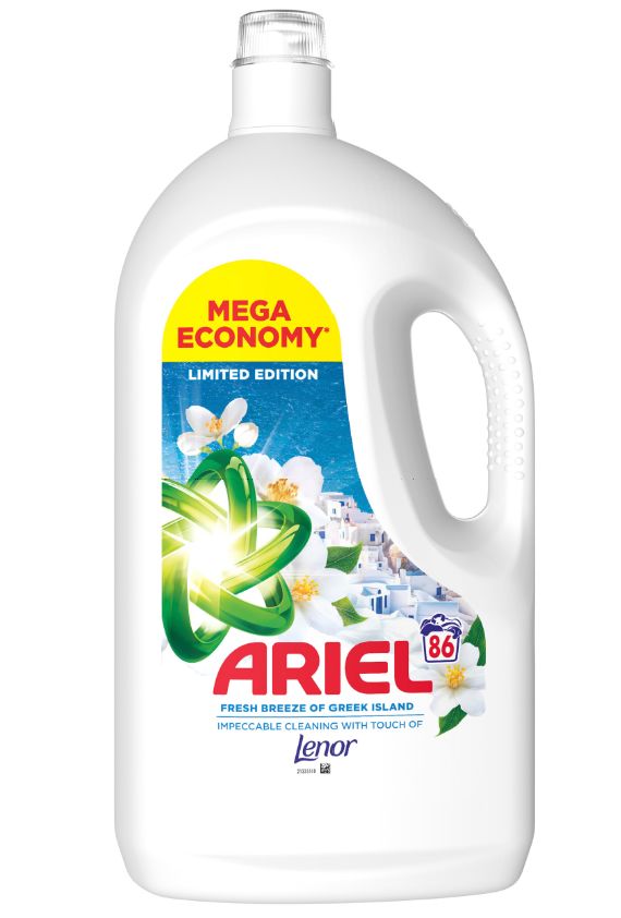 Objavte limitovanú edíciu tekutého pracieho prostriedku ArielGreek Island s osviežujúcou vôňou jazmínu a morskej soli. Dodáva bielizni dokonalú čistotu a dlhotrvajúcu sviežosť. Pre maximálne svieži pôžitok využite celú kolekciu. Skombinujte ho s avivážou Lenor Fresh Breeze of Greek Island a vonnými perličkami Škvrny je možné tiež najskôr ošetriť nanesením tekutého pracieho prostriedku Fresh Breeze of Greek Island, a to nanesením pracieho prostriedku na škvrny pomocou zelenej odmerky, a až potom vložiť oblečenie do práčky. Aby boli výsledky prania čo najlepšie, odmerajte prací prostriedok odmerkou a vlejte ho priamo do bubna práčky.Objem balenia 3,87L na 86 praní.