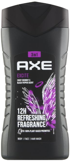 Pánsky sprchový gél Axe Excite s príjemnou vôňou poskytuje pocit sviežosti počas celého dňa. Vhodný pre každý typ pokožky. Sprchový gél aplikujte na mokrú pokožku, vytvorte bohatú penu a umyte. Zabráňte kontaktu s očami. V prípade ich zasiahnutia, oči vypláchnite veľkým množstvom vody. Ak podráždenie oči pretrváva, vyhľadajte lekársku pomoc. Uchovávajte mimo dosahu detí. Objem balenia 250ml.