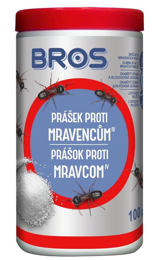 Prášok proti mravcom Bros je určený pre vnútorné priestory a tesné okolie domu, ako sú príjazdové cesty, terasy, záhradné chatky a pod. používať ako vodný roztok alebo prášok. Nasypte asi 2 čajové lyžičky na hniezdo. V prípade vodného roztoku rozpusťte 4 čajové lyžičky v 0,5l vody, premiešajte a nalejte na hniezdo. Zabráňte kontaktu s očami. V prípade ich zasiahnutia, oči vypláchnite dostatočným množstvom vody. Uchovávajte mimo dosahu detí. Obsah balenia 100g.