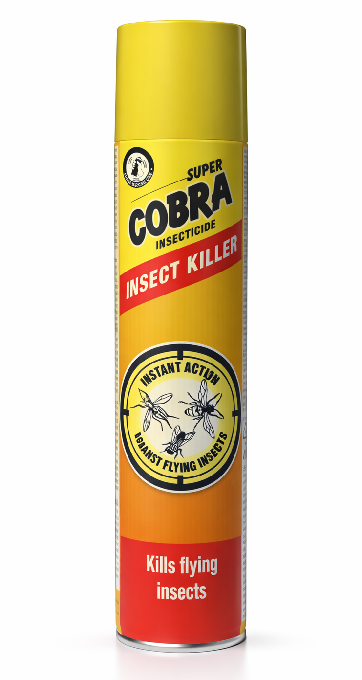 Super Cobra insekticíd na hubenie lietajúceho hmyzu. Hubí lietajúci hmyz v domácnostiach aj vonkajších priestoroch. Rýchlo hubí lietajúci hmyz ako muchy, komáre, osy, mole, ovady a iné. Muchy a komáre – 99% úmrtnosť po 24 hodinách. Návod na použitie: Biocid !Používajte Biocidy bezpečným spôsobom.Pred použitím si vždy prečítajte etiketu a informácie o výrobku. Reg.č.: CCHLP: bio/891/D/10/2/CCHLP. Zatvorte okná a dvere, nádobu dobre pretrepte pred postrekom aj počas neho. Striekajte v krátkych dávkach. Držte nádobu rozstrekovačom nahor a striekajte 5 až 10 sekúnd v miestnosti o rozlohe okolo 12 metrov štvorcových. Nestriekajte zo vzdialenosti menšej ako 1m od steny alebo iných povrchov. Po použití spreju miestnosť opustite aspoň na 20 minút a potom dobre vyvetrajte. Mole: ľahký opar a nechajte pôsobiť. Výrobky typu 18: Insekticídy, akaricídy a produkty na kontrolu iných článkonožcov. Používajte biocidy bezpečným spôsobom.Pred použitím si vždy prečítajte etiketu a informácie o výrobku.