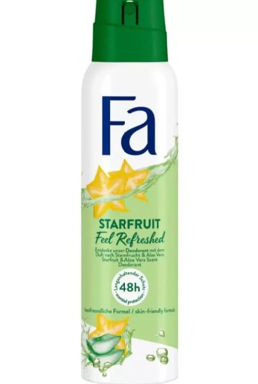 FA Dámsky deodorant 150 ml Starfruit prináša sviežu a exotickú vôňu tropického ovocia, ktorá vás bude sprevádzať počas celého dňa. Jeho účinné zloženie poskytuje spoľahlivú ochranu proti poteniu a nepríjemnému zápachu až na 48 hodín, pričom zanecháva pokožku sviežu a príjemne prevoňanú. Jemná receptúra je šetrná k pokožke, nedráždi ju a je vhodná na každodenné použitie. Praktické balenie v spreji zabezpečuje jednoduchú aplikáciu kedykoľvek počas dňa. Doprajte si pocit čistoty, sviežosti a sebavedomia s vôňou šťavnatého starfruitu.