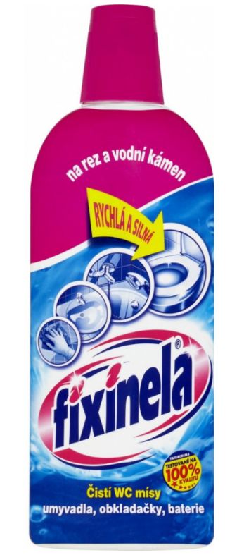 Fixinela na hrdzu a vodný kameň je kyslý čistiaci prostriedok na WC misy, vane, umývadlá, obkladačky, batérie. Odstraňuje hrdzu, vodný kameň a ostatné usadeniny. Upozornenie: Pred použitím výrobku si dôkladne prečítajte návod na použitie. Prípravok nie je vhodný na čistenie hliníkových povrchov. Nepoužívajte spoločne s prípravkami obsahujúcimi aktívny chlór. Nepoužívajte spoločne s alkalickými látkami a zmesami. Návod na použitie: Prípravok nastriekajte na znečistené miesto, nechajte pôsobiť podľa intenzity znečistenia a opláchnite vodou. H315 Dráždi kožu. H319 Spôsobuje vážne podráždenie očí. Bezpečnostné upozornenie: P102 Uchovávajte mimo dosahu detí. P264 Po manipulácii si dôkladne umyte ruky vodou a mydlom. P280 Noste ochranné rukavice aj ochranné okuliare. Prvá pomoc: P301+P312 PO POŽITÁ: ak máte zdravotné problémy, okamžite volajte NÁRODNÉ TOXIKOLOGICKÉ INFORMAČNÉ CENTREM. (Tel.č. 02/54774166) alebo lekára. P302+P352 PRI KONTAKTE S POKOŽKOU: Umyte veľkým množstvom vody a mydla. P332+P313 Ak sa objaví podráždenie pokožky, vyhľadajte lekársku pomoc. P305+P351+P338 PO ZASIAHNUTÍ OČÍ: Niekoľko minút ich opatrne vyplachujte vodou. Ak používate kontaktné šošovky a ak je to možné, odstráňte ich. Pokračujte vo vyplachovaní. P337+P313 Ak podráždenie očí pretrváva: vyhľadajte lekársku pomoc alebo starostlivosť. Pokyny na zneškodnenie: P501 Zneškodnite obsah a obal v mieste zberu nebezpečného alebo špeciálneho odpadu. Zloženie: 5-15% kyselina fosforečná, menej ako 5% aniónový tenzid, farbivo. Spotrebujte do 24 mesiacov od dátumu výroby. Nepoužívajte na vane s poškodenou glazúrou.