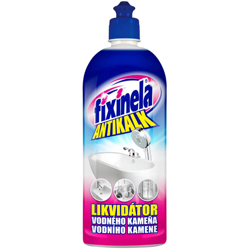 FIXINELA antikalk 665 ml kyslý čistiaci prostriedok na umývadlá, vane, sprchové kúty, vodovodné batérie, WC misy, obkladačky, keramické dlaždice, nerezové drezy odstraňuje vodný kameň, mydlové usaden…