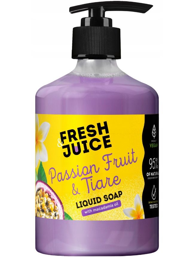 Pocíťte leto s tekutým mydlom Passion Fruit and Tiare od značky Fresh Juice. Očarujúca, sladko-kvetinová vôňa marakuje, prelínajúca sa s jemnosťou kvetu tiare, obklopí vaše telo príjemným, voňavým závojom.Makadamiový olej vyživuje a hydratuje, hĺbkovo regeneruje pokožku, zanecháva ju jemnú, hladkú a ošetrenú. Ľahká konzistencia mydla jemne čistí bez vysušovania, vytvára pocit komfortu a harmónie.Jemnosť a sviežosť v každej kvapke.