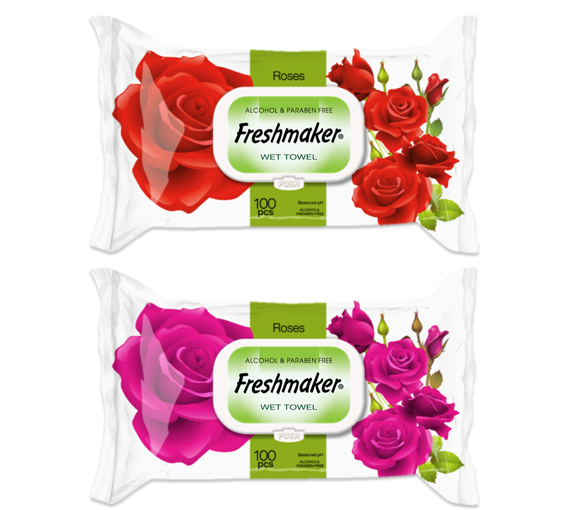 Osviežujúce vlhčené obrúsky Freshmaker s výťažkom z ruže perfektne čistia nečistoty z pokožky a zanechávajú ju vláčnu a jemnú. Pokožku nedráždia. Šetrné k pokožke. Obsah balenia 100ks. EU R.P. :S.C.Turkrom S.A.Calea Munteniei DN2,Foscani,Vrancea-Romania.Tel.0040237212396