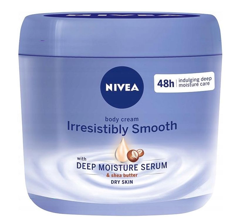 Vyhladzujúci telový krém NIVEA Essentials Irresistibly Smooth je obohatený o hlboko hydratačné sérum a vzácne bambucké maslo. Jemne obopína vašu pokožku a zanecháva ju hodvábne jemnú na dotyk a intenzívne hydratovanú po dobu 48 hodín – už po 1 použití! Intenzívna hydratácia uzavretá v zložení telového krému, ktorá zaisťuje dlhodobo hladšiu pokožku. Pocíťte, ako je vaša suchá pokožka intenzívne hydratovaná a znateľne hladšia po dobu 48 hodín!Objem balenia 400ml.