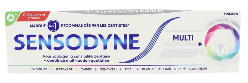 Sensodyne Multi Protection + Whitening je fluoridová zubná pasta určená na každodenné použitie a na úľavu od citlivosti zubov deň za dňom. Denná zubná pasta Sensodyne Multi Protection + ponúka viacero výhod pre vaše ústa a tiež klinicky overenú ochranu pred citlivosťou zubov. Pomáha: – Posilňovať sklovinu – Podporovať zdravé ďasná – Chrániť pred zubným kazom – Hĺbkovo čistiť – Osviežovať dych – Odstraňovať zubný povlak – Zmierňovať citlivosť zubov – Bieliť zuby